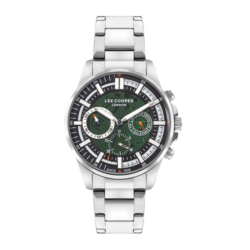 Мъжки часовник Lee Cooper с корпус от супер метал. Мултифункционален дисплей с луминисцентно покритие на стрелките и индексите. Стъкло минерал-кристал. Метална верижка в сребрист цвят. Задвижва се от кварцов механизъм. Водоустойчивост 5 ATM - допускат се леки пръски и взимане на душ, не се препоръчва обилно мокрене.