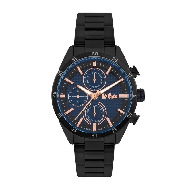 Спортно-елегантен мъжки часовник Lee Cooper. Моделът е с тъмносин мултифункционален дисплей с розовозлатисти стрелки и индекси. Стъкло минерал-кристал. Корпус от супер метал в комбинация с метална верижка. Задвижва се от кварцов механизъм. Водоустойчивост 5 ATM - допускат се леки пръски и взимане на душ, не се препоръчва обилно мокрене.