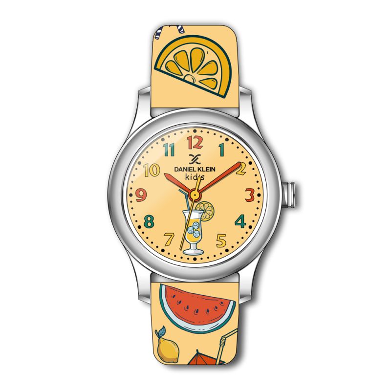Детски часовник Daniel Klein с цветен дизайн в свежи цветове. Моделът е с аналогов дисплей и минерално стъкло. Метален корпус съчетан със силиконова каишка. Задвижва се от кварцов механизъм. Водоустойчивост 3 ATM - допускат се леки пръски, не се препоръчва обилно мокрене.