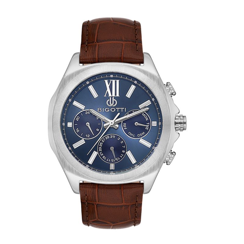 Стилен мъжки часовник Bigotti от колекцията Raffinato. Метален корпус в комбинация с каишка от естствена кожа. Син милутифункционален дисплей със сребристи детайли. Стъкло минерал-кристал. Кварцов механизъм. Водоустойчивост 5 ATM - допускат се леки пръски и взимане на душ, не се препоръчва обилно мокрене.