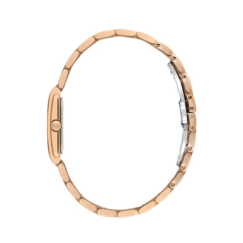 Елегантен дамски часовник с декорация от инкрустирани кристали. Аналогов дисплей в цвят розово злато. Стъкло минерал-кристал. Корпус и верижка изработени от неръждаема стомана. Задвижва се от кварцов механизъм. Водоустойчивост 5 ATM - допускат се леки пръски и взимане на душ, не се препоръчва обилно мокрене.