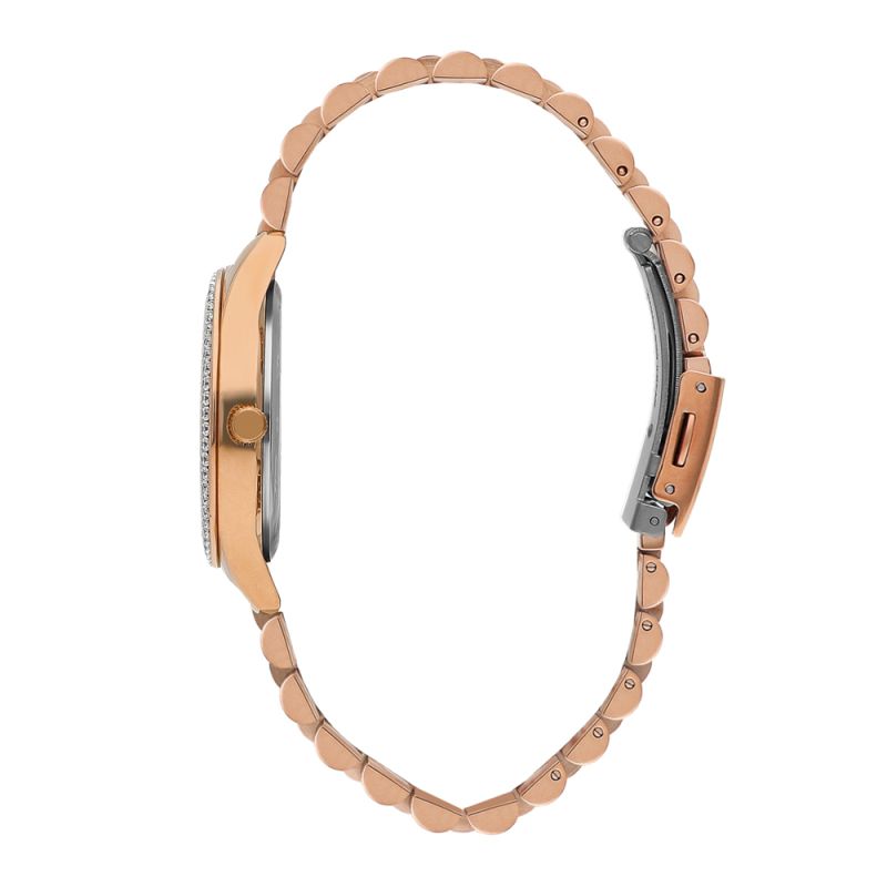 Стилен дамски часовник Lee Cooper с корпус от супер метал. Моделът е с красива декорация от нежни кристали върху безела и циферблата. Стъкло минерал-кристал. Метална верижка в цвят розово злато. Задвижва се от кварцов механизъм. Водоустойчивост 3 ATM - допускат се леки пръски, не се препоръчва обилно мокрене.