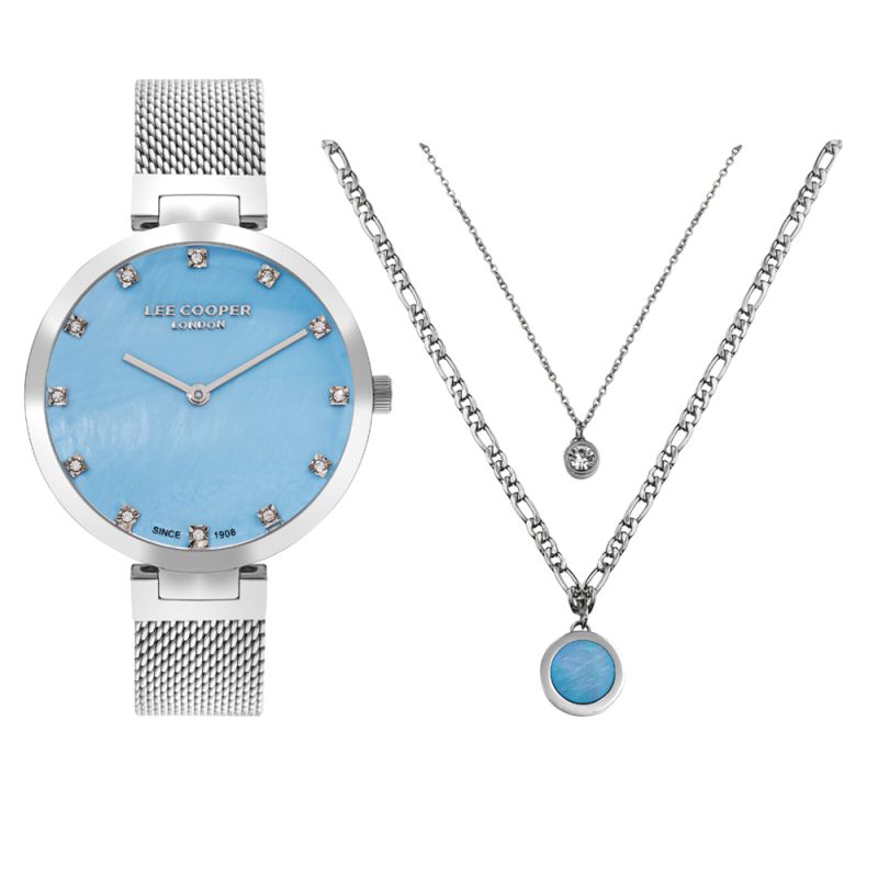 Комплект дамски часовник и колие Lee Cooper. Часовникът е с корпус и меш верижка изработени от метал. Седефен циферблат с нежни кристали. Стъкло минерал-кристал. Задвижва се от кварцов механизъм. Водоустойчивост на часовника 3 ATM - допускат се леки пръски, не се препоръчва обилно мокрене. Колието е изработено от неръждаема стомана.