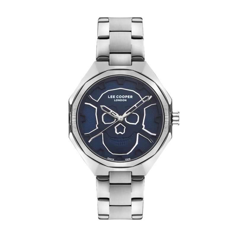 Мъжки часовник Lee Cooper с интересен дизайн. Ефектен циферблат с декорация череп. Стъкло минерал-кристал. Корпус изработен от супер метал. Метална верижка в цвят сребро. Моделът се задвижва от кварцов механизъм. Водоустойчивост 5 ATM - допускат се леки пръски и взимане на душ, не се препоръчва обилно мокрене.