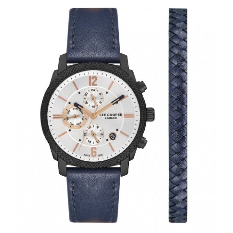 Комплект мъжки часовник и гривна Lee Cooper. Часовникът е с корпус от супер метал и кожена каишка. Стъкло минерал-кристал. Мултифункционален дисплей с показатели за дата, ден и двойно време. Задвижва се от кварцов механизъм. Водоустойчивост 3 ATM - допускат се леки пръски, не се препоръчва обилно мокрене. Гривната е от естествена кожа в тъмносин цвят.