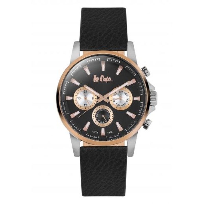 Мъжки часовник Lee Cooper с черен мултифункционален дисплей. Моделът е с корпус от супер метал и черна кожена каишка. Стъкло минерал-кристал. Задвижва се от кварцов механизъм. Водоустойчивост 3 ATM - допускат се леки пръски, не се препоръчва обилно мокрене.