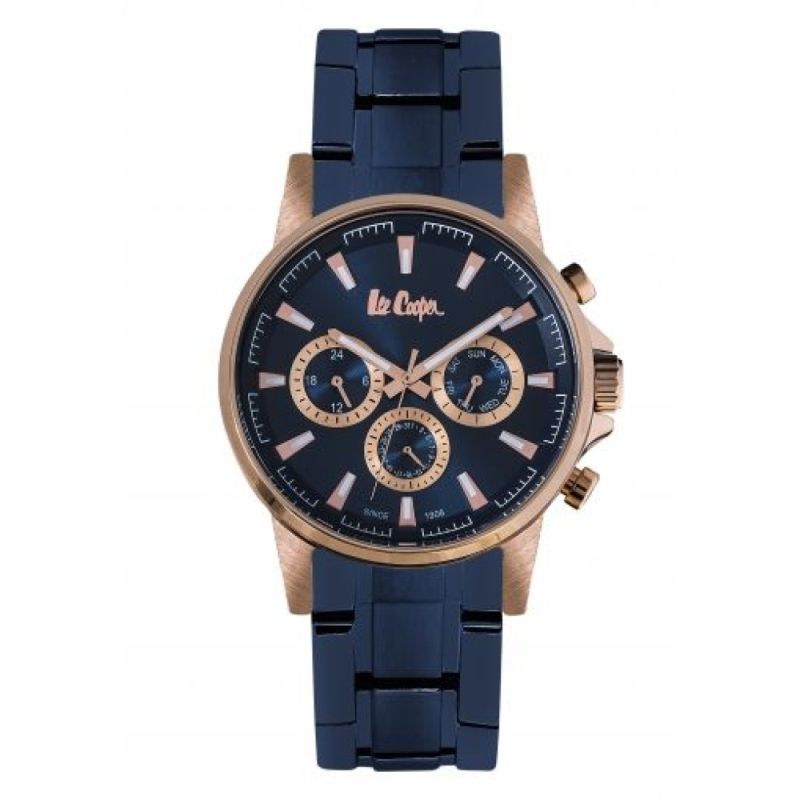 Спортно-елегантен мъжки часовник Lee Cooper със син мултифункционален дисплей. Моделът е с корпус и верижка от супер метал. Стъкло минерал-кристал. Задвижва се от кварцов механизъм. Водоустойчивост 3 ATM - допускат се леки пръски, не се препоръчва обилно мокрене.