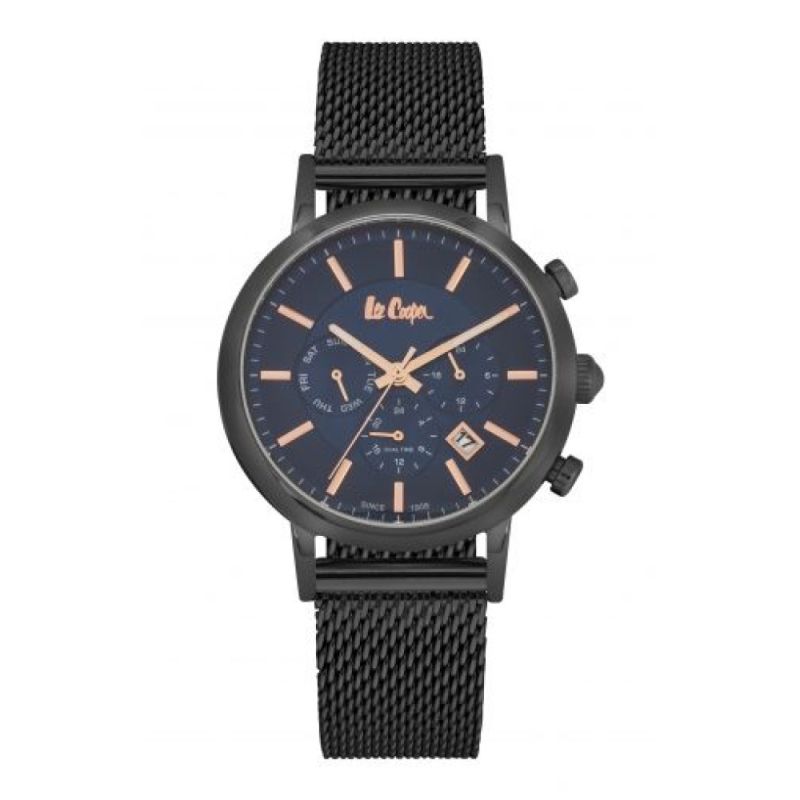 Класически модел мъжки часовник Lee Cooper с модерна визия от колекцията Classic Dual Time. Корпус от супер метал и стъкло минерал-кристал. Черна верижка от неръждаема стомана. Мултифункционален дисплей с показатели за дата, ден и двойно време. Задвижва се от кварцов механизъм. Водоустойчивост 3 ATM - допускат се леки пръски, не се препоръчва обилно мокрене.