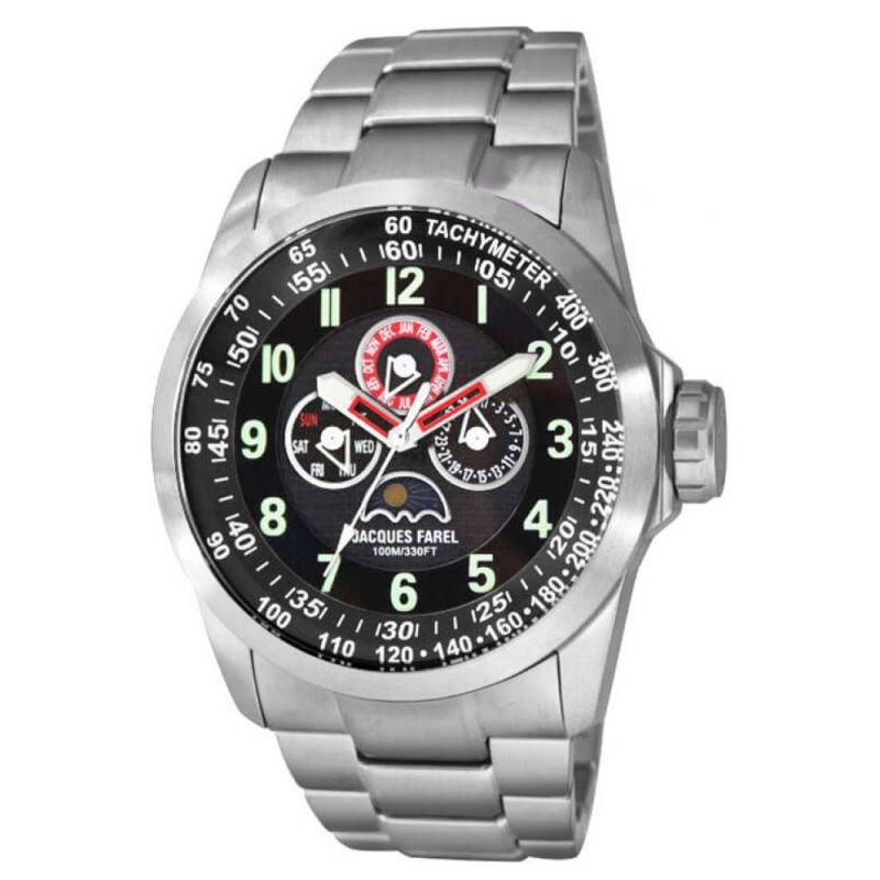 Мъжки спортно-елегантен часовник Jacques Farel. Корпус и верижка изработени от неръждаема стомана. Завинтваща се коронка. Минерално стъкло с антирефлексно покритие. Мултифункционален дисплей с показатели за дата, ден от седмицата и месец. Кварцов механизъм. Водоустойчивост 10 ATM - позволява мокрене, къпане и плуване във водни басейни.