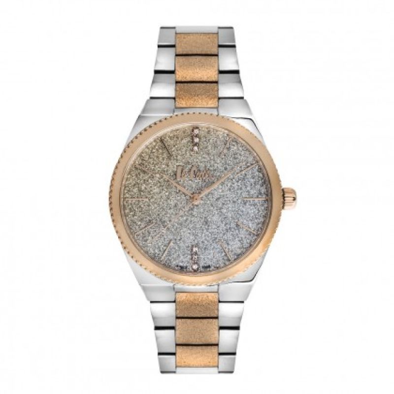 Дамски часовник Lee Cooper от колекцията Elegance. Верижка и корпус изработени от супер метал. Стъкло минерал-кристал. Моделът е с бляскав аналогов дисплей, преливащ от розово-златист в сребрис цвят с декорация от нежни кристали. Задвижва се от кварцов механизъм. Водоустойчивост 3 ATM - допускат се леки пръски, не се препоръчва обилно мокрене.
