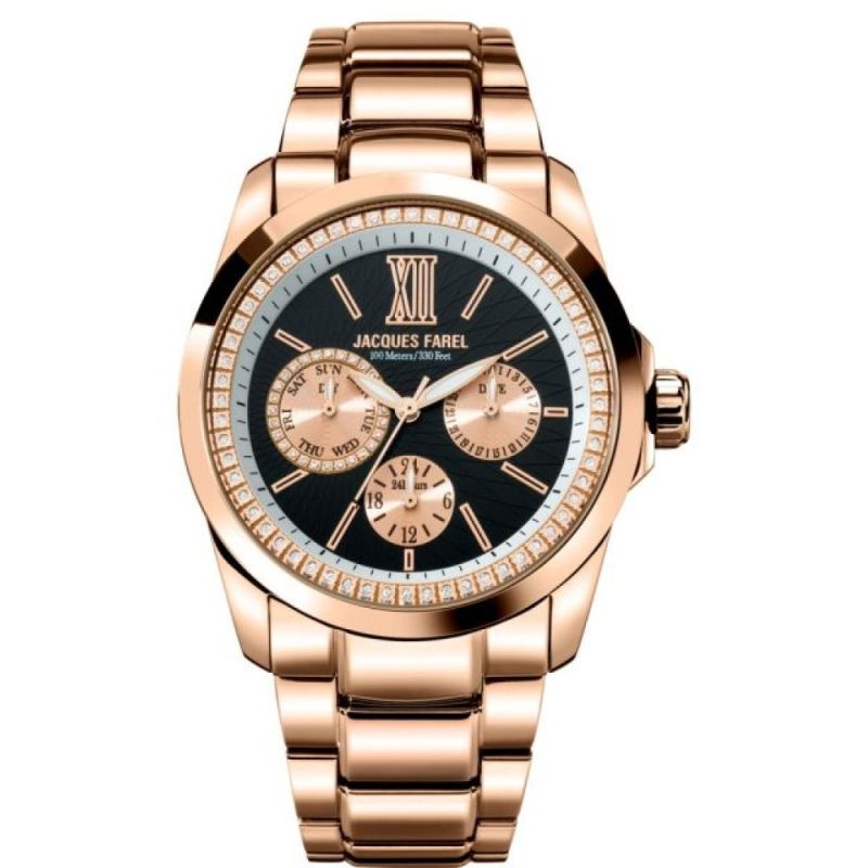Дамски часовник Jacques Farel със спортно-елегантна визия и декорация от нежни кристали. Моделът е с корпус и верижка от неръждаема стомана в цвят розово злато. Минерално стъкло с антирефлексно покритие. Мултифункционален дисплей с фосфоресцентно покритие на стрелките. Кварцов механизъм. Водоустойчивост 10 ATM - позволява мокрене, къпане и плуване във водни басейни.