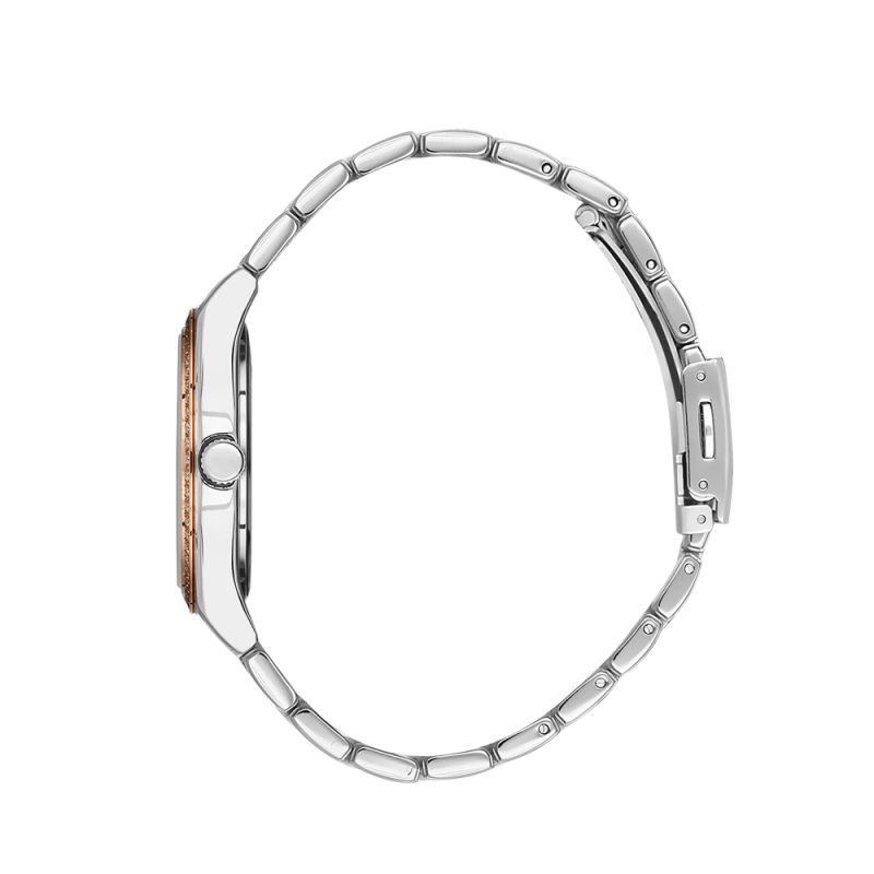 Стилен дамски часовник с модерен дизайн от колекцията Luxury. Сребрист аналогов дисплей с показател за дата. Красива декорация от нежни кристали по ринга. Минерално стъкло, устойчиво на надраскване. Метален корпус в комбинация с верижка от неръждаема стомана. Задвижва се от кварцов механизъм. Водоустойчивост 5 ATM - допускат се леки пръски и взимане на душ, не се препоръчва обилно мокрене.