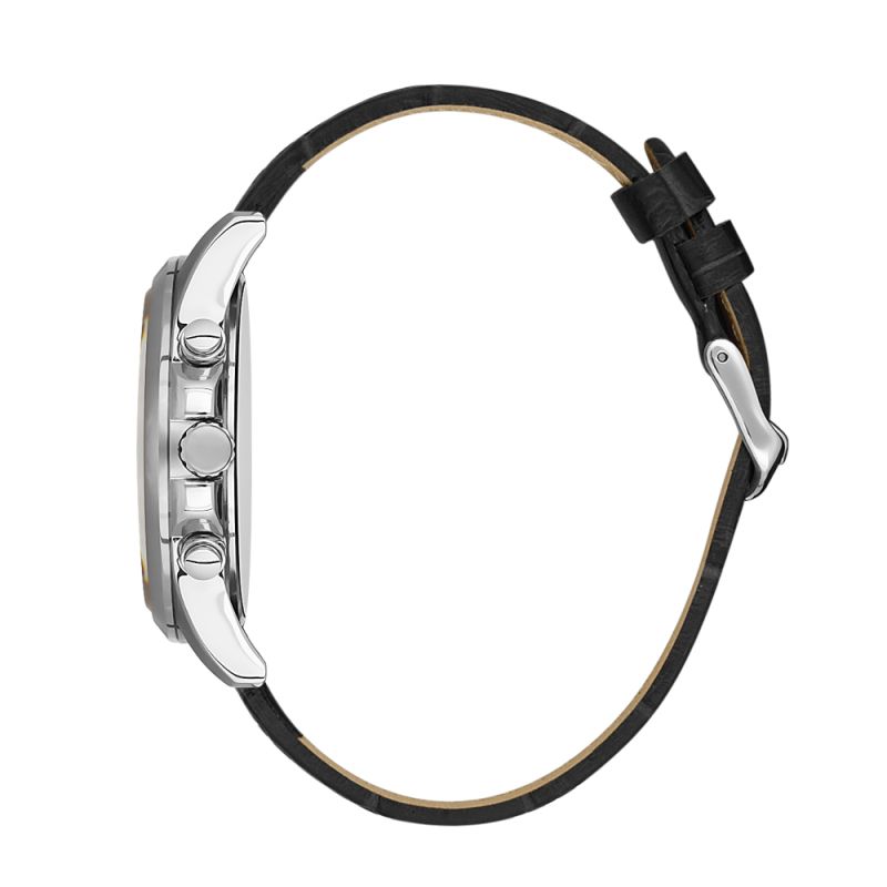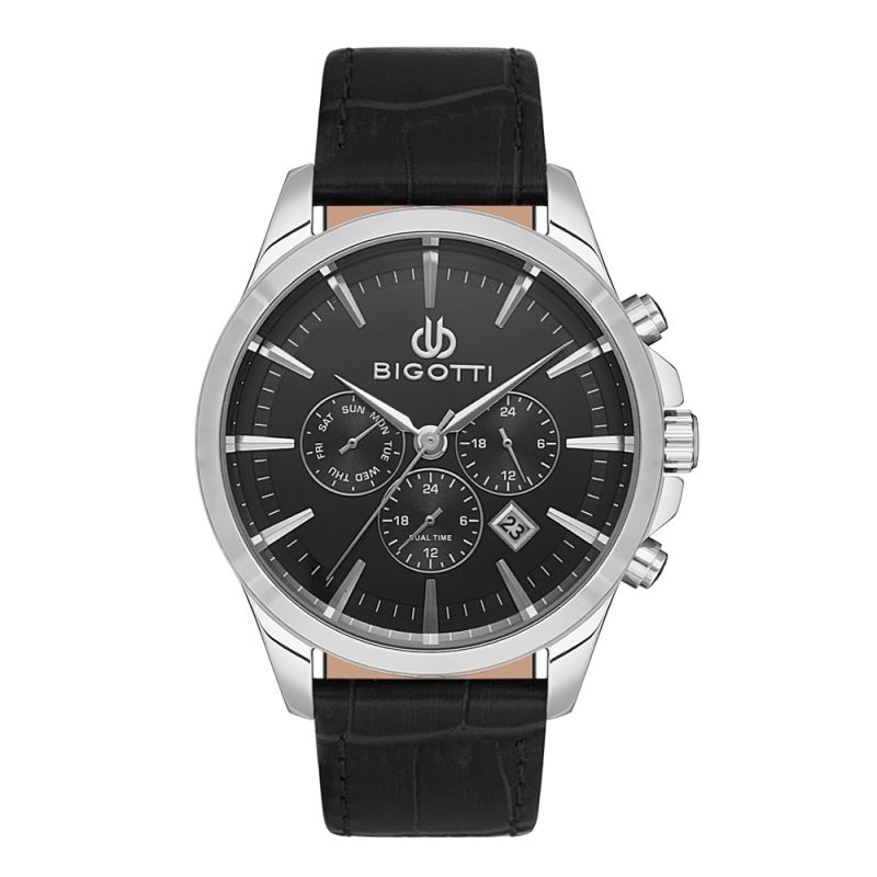 Стилен мъжки часовник Bigotti. Черен мултифункционален дисплей със сребристи детайли. Минерално стъкло, устойчиво на надраскване. Моделът е с метален корпус и каишка от естествена кожа. Задвижва се от кварцов механизъм. Водоустойчивост 5 ATM - допускат се леки пръски и взимане на душ, не се препоръчва обилно мокрене.