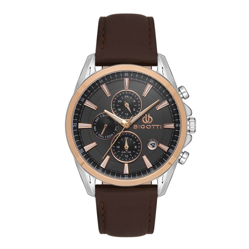 Спортно-елегантен мъжки часовник Bigotti с мултифункционален дисплей. Метален корпус в комбинация с кожена каишка. Минерално стъкло, устойчиво на надраскване. Моделът се задвижва от кварцов механизъм. Водоустойчивост 5 ATM - допускат се леки пръски и взимане на душ, не се препоръчва обилно мокрене.