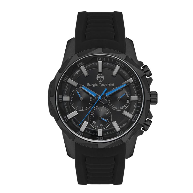 Мъжки часовник Sergio Tacchini с модерна спортно-ежедневна визия. Корпус изработен от неръждаема стомана. Черна силиконова каишка. Черен мултифункционален дисплей със сини детайли. Стъкло минерал-кристал. Кварцов механизъм. Водоустойчивост 5 ATM - допускат се леки пръски и взимане на душ, не се препоръчва обилно мокрене.