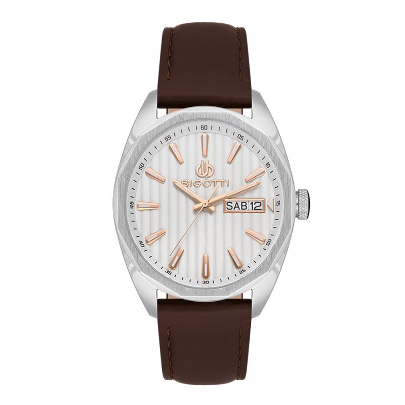 Мъжки часовник Bigotti със стилен дизайн от колекцията Raffinato. Метален корпус в комбинация с кожена каишка. Сив аналогов дисплей с детайли в цвят розово злато и показател за ден и дата. Минерално стъкло, устойчиво на надраскване. Кварцов механизъм. Водоустойчивост 5 ATM - допускат се леки пръски и взимане на душ, не се препоръчва обилно мокрене.