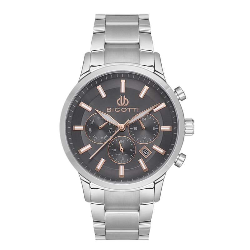 Спортно-елегантен мъжки часовник Bigotti с мултифункционален дисплей. Луминисцентно покритие на стрелките и индексите. Минерално стъкло, устойчиво на надраскване. Моделът е с метален корпус и верижка от неръждаема стомана. Задвижва се от кварцов механизъм. Водоустойчивост 5 ATM - допускат се леки пръски и взимане на душ, не се препоръчва обилно мокрене.