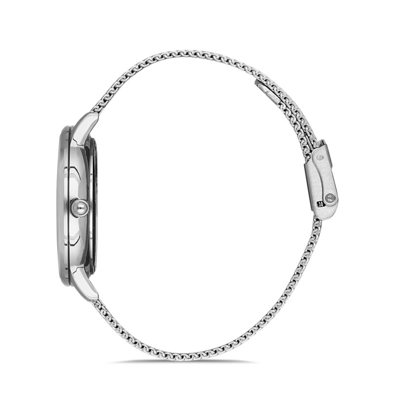 Дамски часовник Daniel Klein от колекцията Premium. Сребрист аналогов дисплей с интересен дизайн и бляскави детайли. Стъкло минерал-кристал. Моделът е с меш верижка от неръждаема стомана и метален корпус. Кварцов механизъм. Водоустойчивост 3 ATM - допускат се леки пръски, не се препоръчва обилно мокрене.