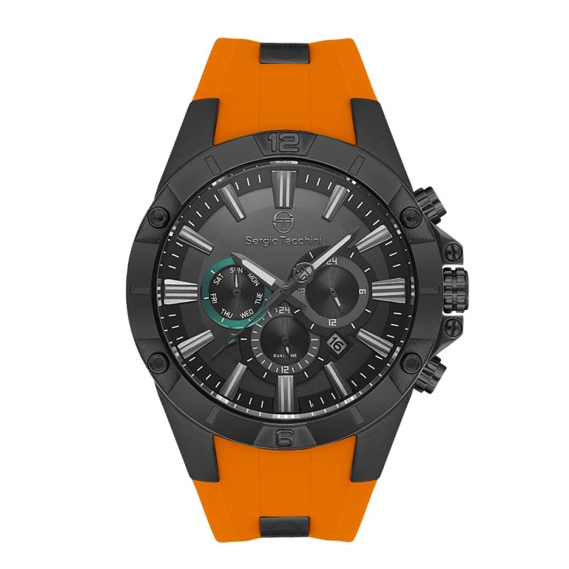 Спортен модел мъжки часовник Sergio Tacchini с мултифункционален дисплей. Минерално стъкло, устойчиво на надраскване. Корпус от неръждаема стомана в комбинация със силиконова каишка. Кварцов механизъм. Водоустойчивост 5 ATM - допускат се леки пръски и взимане на душ, не се препоръчва обилно мокрене.