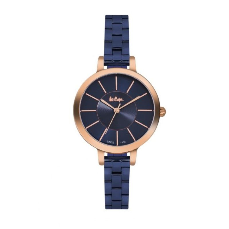 Елегантен модел дамски часовник Lee Cooper. Корпусът и верижката са изработени от специална сплав - супер метал. Стъкло минерал-кристал. Аналогов дисплей в син цвят. Кварцов механизъм. Водоустойчивост 3 ATM - допускат се леки пръски, не се препоръчва обилно мокрене.