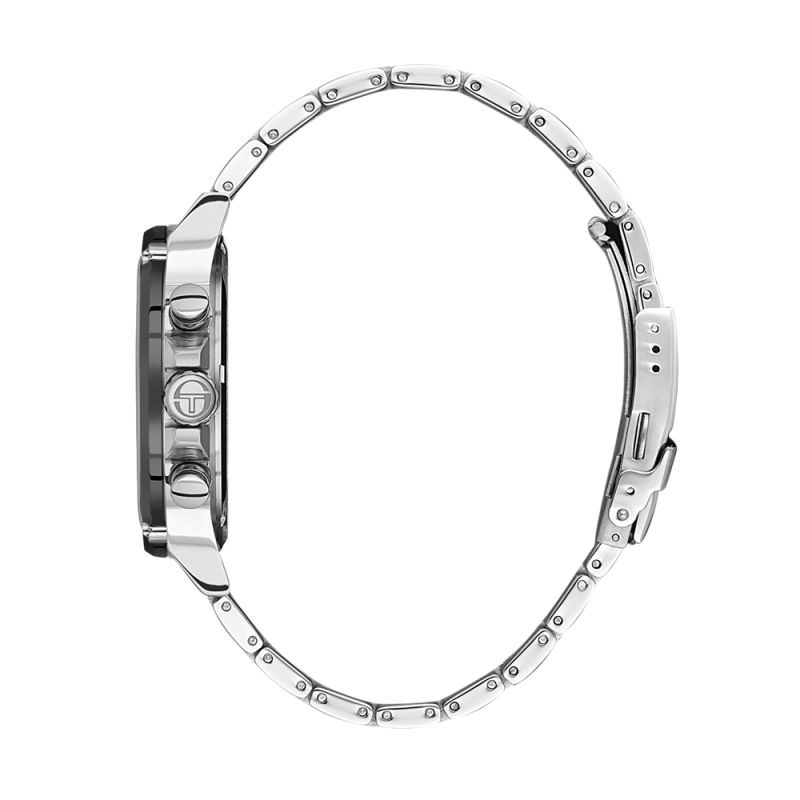 Мъжки часовник Sergio Tacchini с мултифункционален дисплей. Моделът е с корпус и верижка изработени от неръждаема стомана. Минерално стъкло, устойчиво на надраскване. Задвижва се от кварцов механизъм. Водоустойчивост 5 ATM - допускат се леки пръски и взимане на душ, не се препоръчва обилно мокрене.