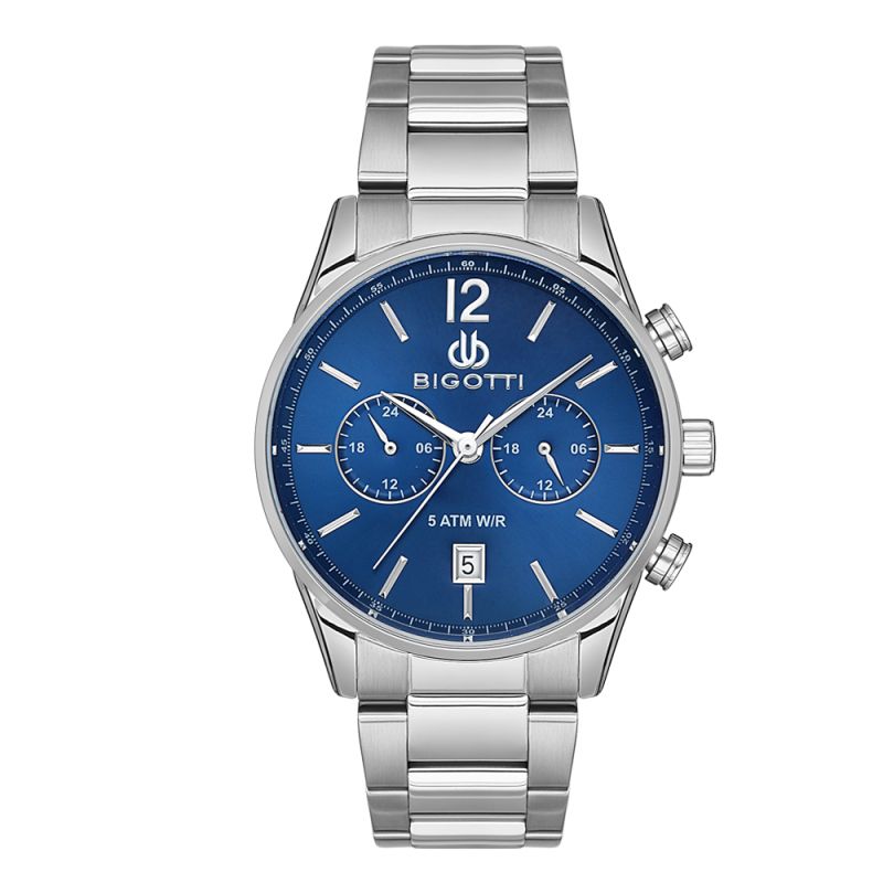 Спортно-елегантен мъжки часовник Bigotti. Син мултифункционален дисплей със сребристи детайли и показатели за двойно време и дата. Минерално стъкло, устойчиво на надраскване. Моделът е с метален корпус и верижка от неръждаема стомана. Задвижва се от кварцов механизъм. Водоустойчивост 5 ATM - допускат се леки пръски и взимане на душ, не се препоръчва обилно мокрене.