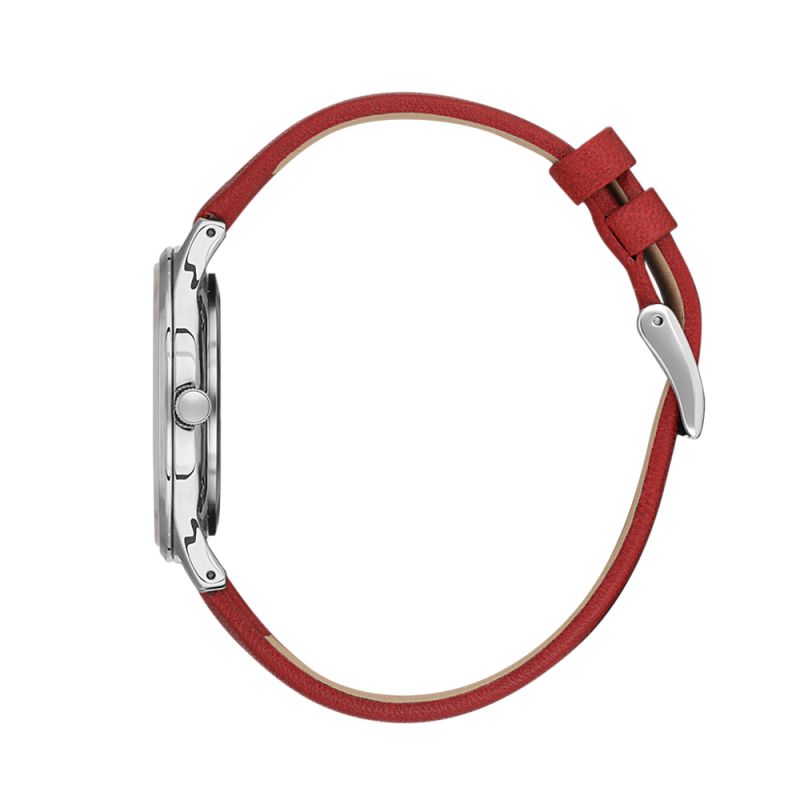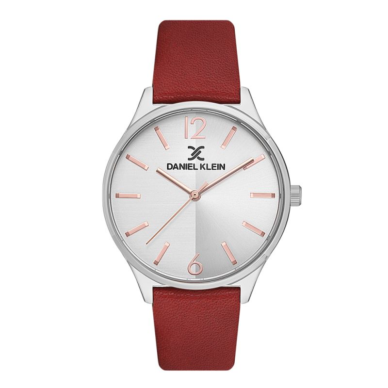 Дамски часовник Daniel Klein от колекцията Premium. Сребрист аналогов дисплей със стрелки, цифри и индекси в цвят розово злато. Метален корпус в комбинация с червена каишка от естествена кожа. Стъкло минерал-кристал. Задвижва се от кварцов механизъм. Водоустойчивост 3 ATM - допускат се леки пръски, не се препоръчва обилно мокрене.