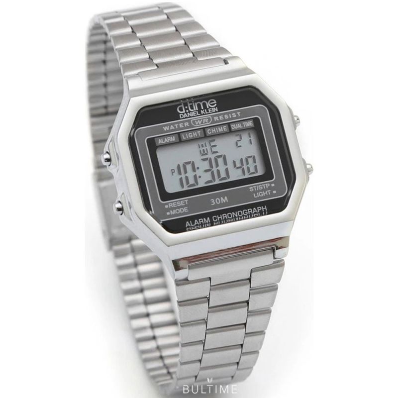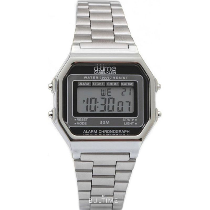 Дамски часовник Daniel Klein от колекцията D Time. Корпус от полимер, съчетан с верижка от неръждаема стомана. Дигитален дисплей с плексигласово стъкло. Моделът има следните функции: показател за дата и ден от седмицата, 12/24 часов формат, второ време, хронограф, аларма и осветяване на дисплея. Задвижва се от кварцов механизъм. Водоустойчивост 3 ATM - допускат се леки пръски, не се препоръчва обилно мокрене.