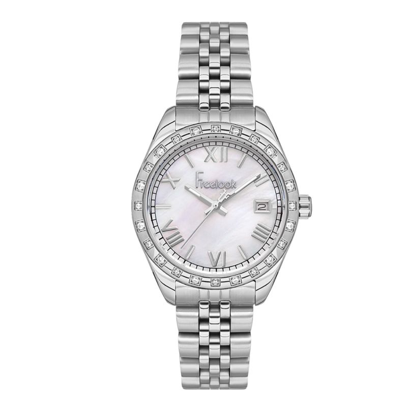Дамски часовник Freelook от колекцията Lumiere. Седеф аналогов дисплей с показател за дата. Декорация от нежни кристали по безела. Стъкло минерал-кристал. Моделът е с метален корпус и верижка от неръждаема стомана. Задвижва се от кварцов механизъм. Водоустойчивост 5 ATM - допускат се леки пръски и взимане на душ, не се препоръчва обилно мокрене.