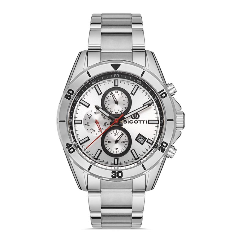 Спортно-елегантен мъжки часовник Bigotti с мултифункционален дисплей от колекцията Milano. Минерално стъкло, устойчиво на надраскване. Метален корпус в комбинация с верижка от неръждаема стомана. Моделът се задвижва от кварцов механизъм. Водоустойчивост 5 ATM - допускат се леки пръски и взимане на душ, не се препоръчва обилно мокрене.