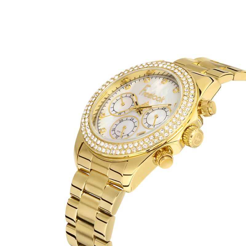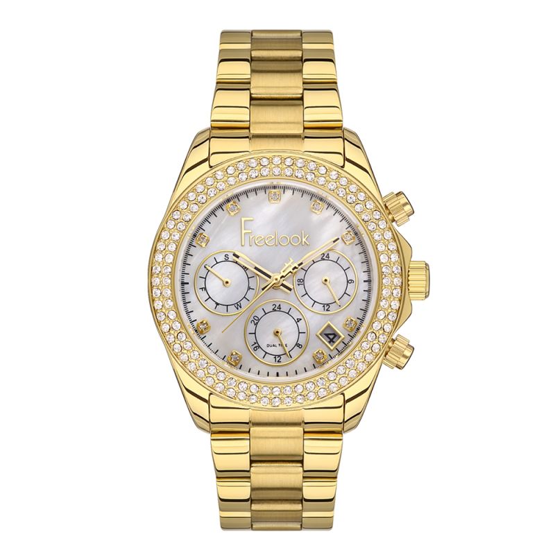 Дамски часовник Freelook от колекцията Charmant. Моделът е със седефен мултифункционален дисплей и богата декорация от нежни кристали. Стъкло минерал-кристал. Метален корпус в комбинация с верижка от неръждаема стомана. Задвижва се от кварцов механизъм. Водоустойчивост 5 ATM - допускат се леки пръски и взимане на душ, не се препоръчва обилно мокрене.