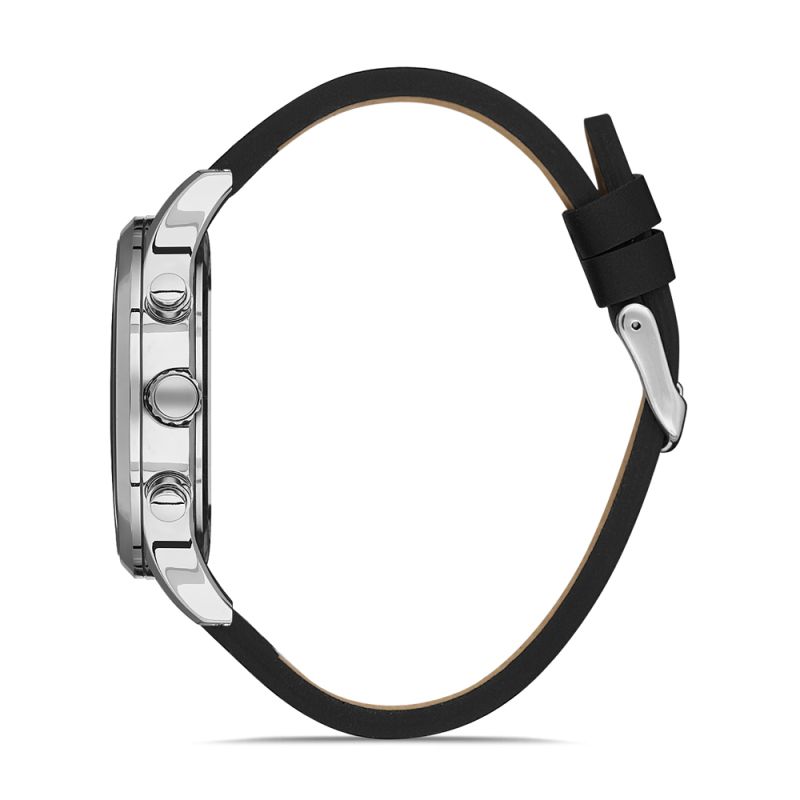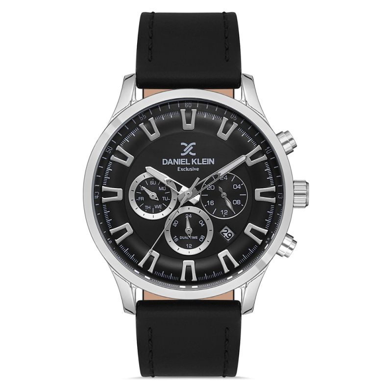 Мъжки часовник Daniel Klein с черна кожена каишка от колекцията Exclusive. Корпус от метал. Мултифункционален дисплей с показатели за дата, ден и двойно време. Стъкло минерал-кристал. Кварцов механизъм. Водоустойчивост 5 ATM - допускат се леки пръски и взимане на душ, не се препоръчва обилно мокрене.