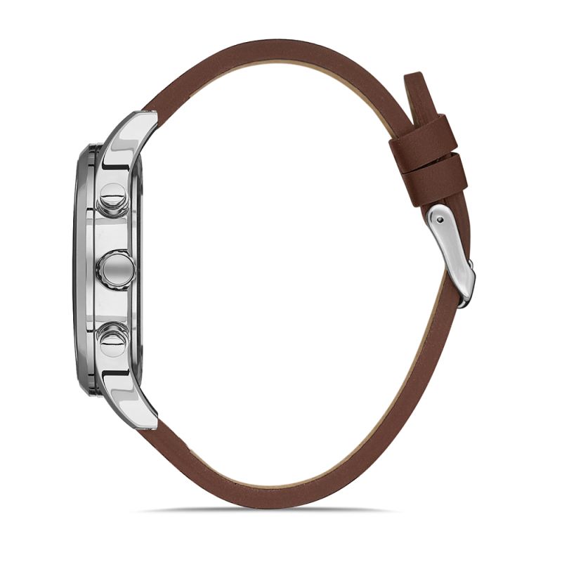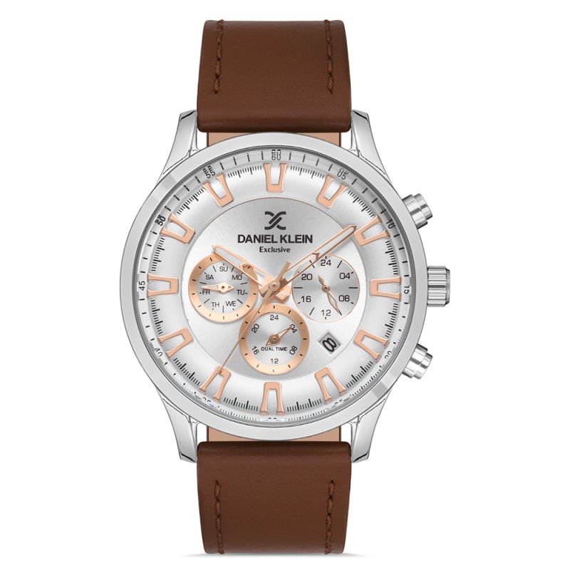 Мъжки часовник Daniel Klein с кафява кожена каишка от колекцията Exclusive. Корпус от метал. Мултифункционален дисплей с показатели за дата, ден и двойно време. Стъкло минерал-кристал. Кварцов механизъм. Водоустойчивост 5 ATM - допускат се леки пръски и взимане на душ, не се препоръчва обилно мокрене.