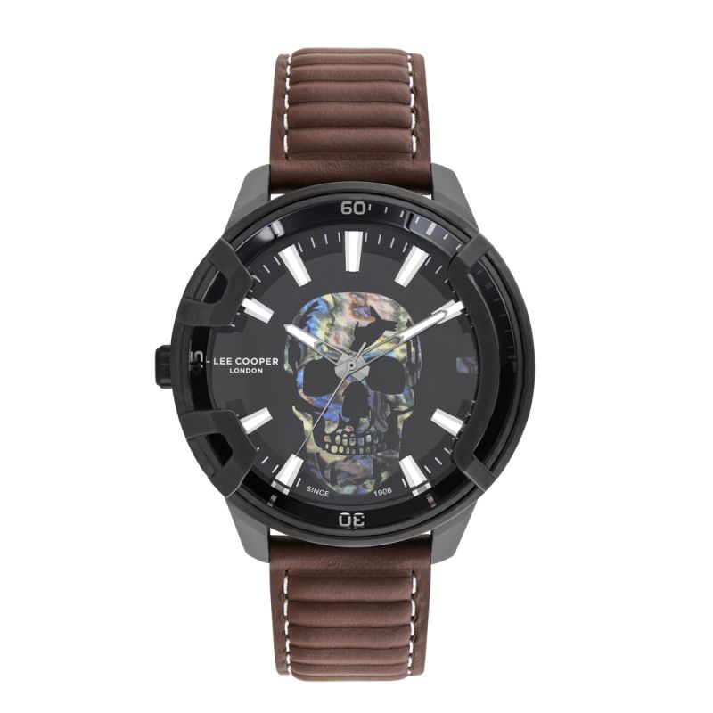 Мъжки часовник Lee Cooper със спортно-ежедневен дизайн. Черен циферблат, декориран с цветен череп. Стъкло минерал-кристал. Корпус изработен от супер метал. Тъмнокафява каишка от естествена кожа. Задвижва се от кварцов механизъм. Водоустойчивост 5 ATM - допускат се леки пръски и взимане на душ, не се препоръчва обилно мокрене.