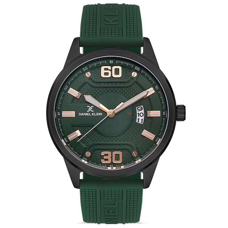 Мъжки часовник Daniel Klein от колекция Premium. Моделът е с метален корпус и тъмнозелена силиконова каишка. Аналогов дисплей с минерално стъкло и показател за дата. Задвижва се от кварцов механизъм. Водоустойчивост 5 ATM - допускат се леки пръски и взимане на душ, не се препоръчва обилно мокрене.