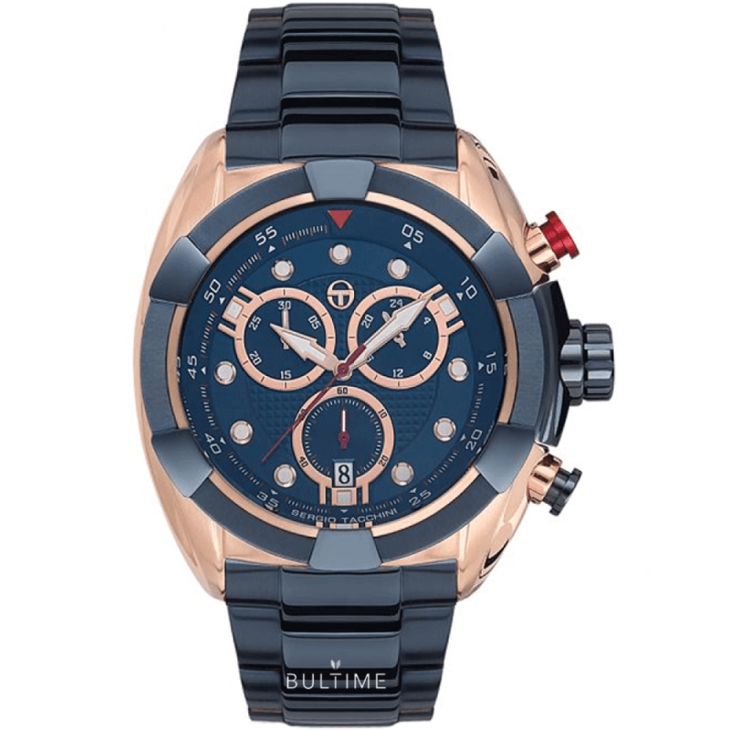 Мъжки часовник Sergio Tacchini от колекцията Heritech S. Моделът е с корпус и верижка от неръждаема стомана. Тъмносин дисплей хронограф. Фосфоресцентно покритие на стрелките и индексите. Минерално стъкло, устойчиво на надраскване. Прецизен кварцов механизъм, произведен в Япония. Водоустойчивост 10 ATM - позволява мокрене, къпане и плуване във водни басейни.