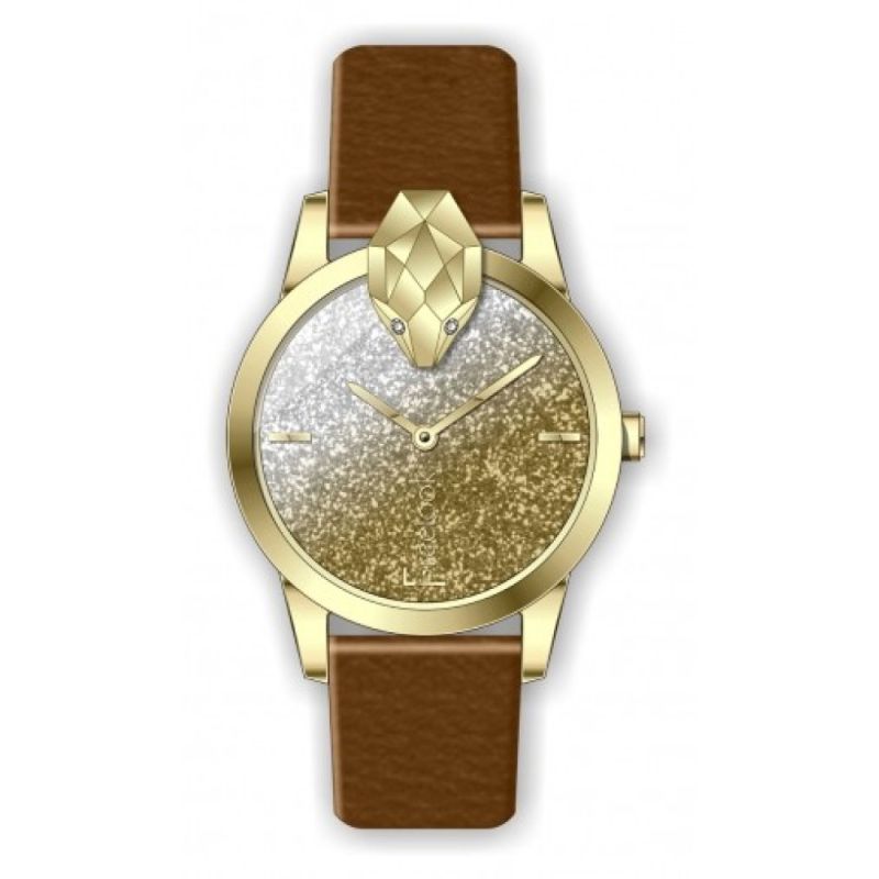 Дамски часовник Freelook от колекцията Belle с интересна визия. Моделът е с аналогов дисплей с бляскава основа и преливащ сиво-златист цвят, декорация във формата на змийска глава на ринга. Кафява каишка от естествена кожа. Метален корпус. Стъкло минерал-кристал. Кварцов механизъм. Водоустойчивост 5 ATM - допускат се леки пръски и взимане на душ, не се препоръчва обилно мокрене.