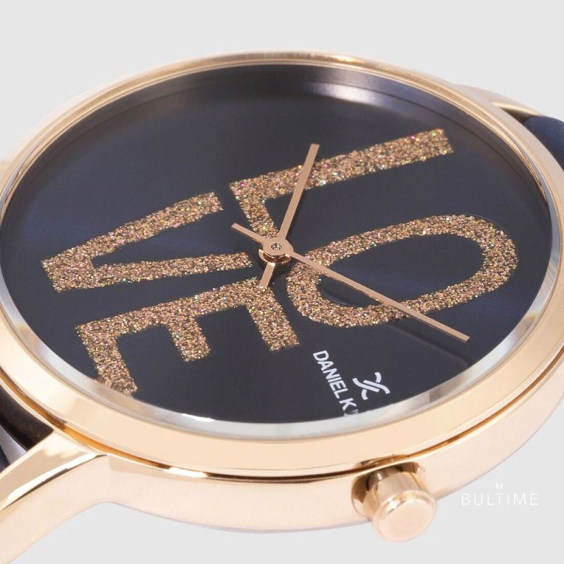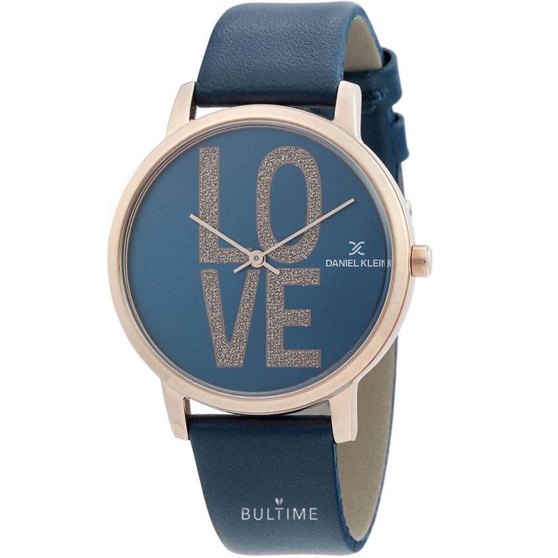 Дамски часовник Daniel Klein от колекцията Trendy. Моделът е с аналогов дисплей с бляскав надпис LOVE. Стъкло минерал-кристал. Корпус изработен от висококачествена метална сплав. Каишка от естествена кожа. Задвижва се от кварцов механизъм. Водоустойчивост 3 ATM - допускат се леки пръски, не се препоръчва обилно мокрене.