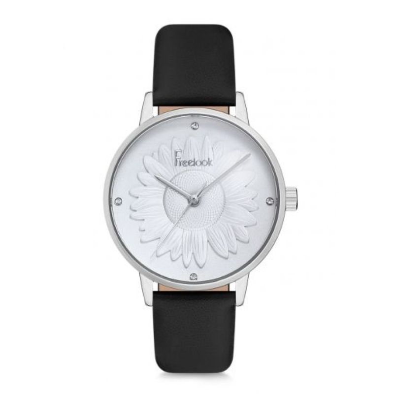 Дамски часовник Freelook с модерен и красив дизайн от колекцията Fashion. Моделът е с корпус от неръждаема стомана и каишка от естествена кожа. Стъкло минерал-кристал. Аналогов дисплей с релефно цвете в средата и декорация от инкрустирани кристали. Кварцов механизъм. Водоустойчивост 3 ATM - допускат се леки пръски, не се препоръчва обилно мокрене.