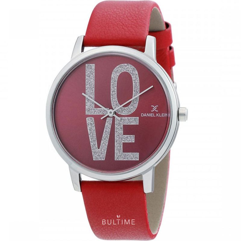 Дамски часовник Daniel Klein от колекцията Trendy. Моделът е с аналогов дисплей с бляскав надпис LOVE. Стъкло минерал-кристал. Корпус изработен от висококачествена метална сплав. Каишка от естествена кожа. Задвижва се от кварцов механизъм. Водоустойчивост 3 ATM - допускат се леки пръски, не се препоръчва обилно мокрене.