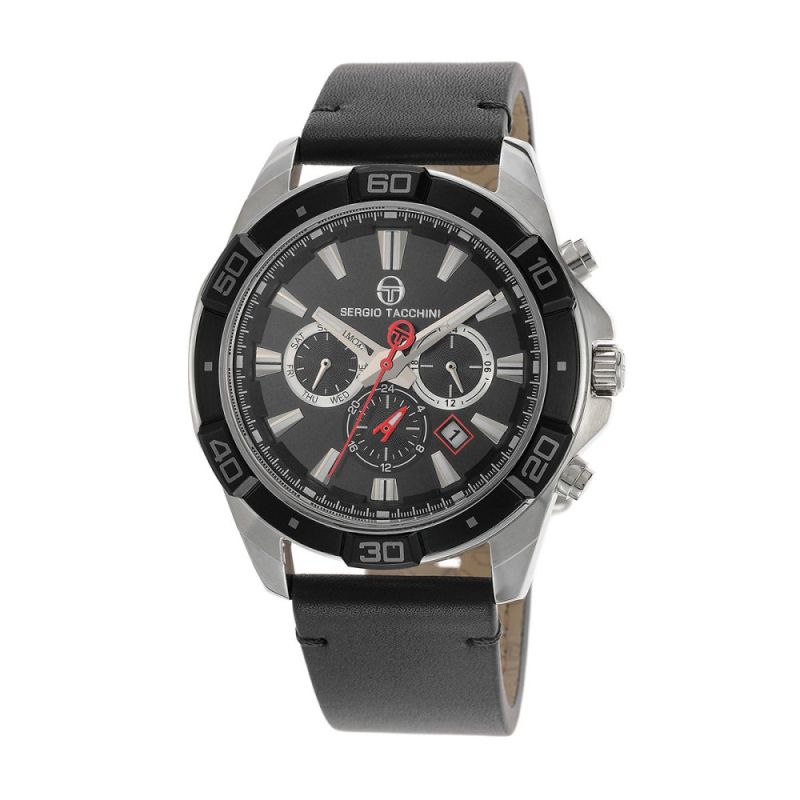 Мъжки часовник Sergio Tacchini с мултифункционален дисплей от колекцията Archivio. Корпус от неръждаема стомана, съчетан с черна кожена каишка. Стъкло минерал-кристал. Задвижва се от кварцов механизъм. Водоустойчивост 5 ATM - допускат се леки пръски и взимане на душ, не се препоръчва обилно мокрене.