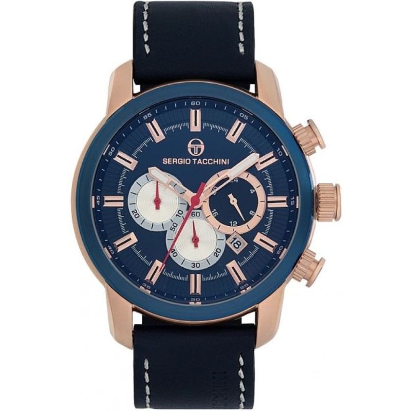 Спортно-елегантен мъжки часовник Sergio Tacchini от колекцията Archivio Chronograph. Моделът е с тъмносин дисплей хронограф с точност 1/60 от минутата и максимално измервано време 30 минути. Фосфоресциращи стрелки. Минерално стъкло, устойчиво на надраскване с антирефлексно покритие. Корпус от неръждаема стомана, съчетан с каишка от естествена кожа. Прецизен кварцов механизъм JS25 CITIZEN MIYOTA произведен в Япония. Водоустойчивост 10 ATM - позволява мокрене, къпане и плуване във водни басейни.