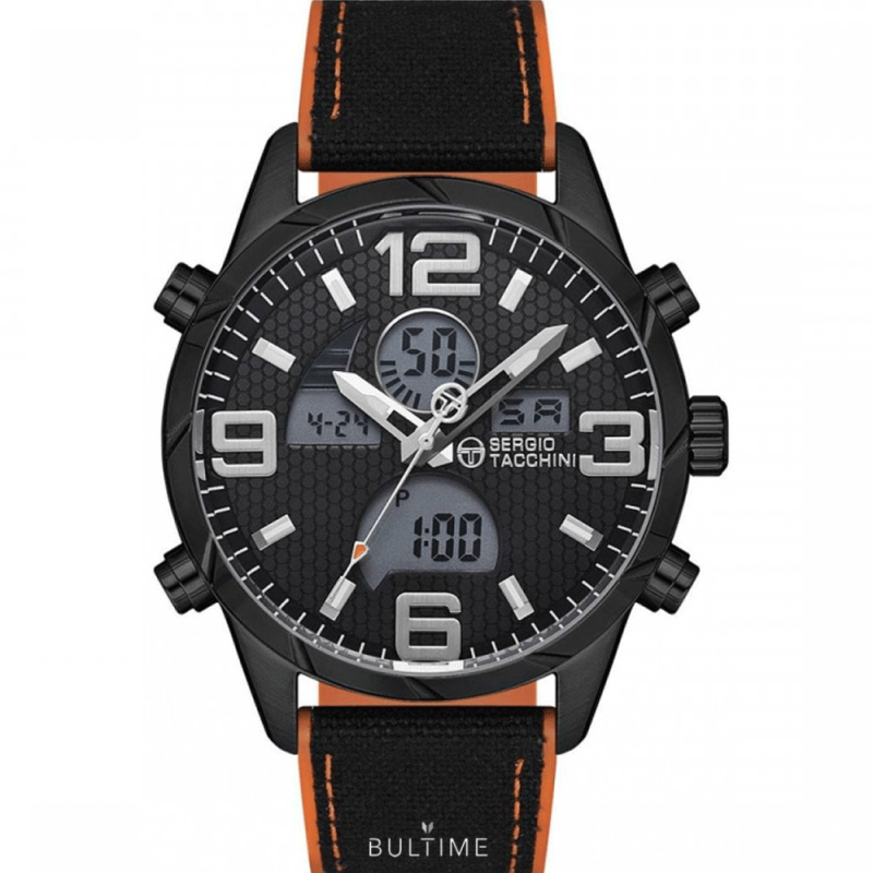 Спортно-елегантен мъжки часовник Sergio Tacchini от колекцията Archivio. Моделът е с черен дисплей с дигитални показатели и аналогови стрелки. Стъкло минерал-кристал. Корпус от метал, съчетан със силиконова каишка. Кварцов механизъм. Водоустойчивост 5 ATM - допускат се леки пръски и взимане на душ, не се препоръчва обилно мокрене.