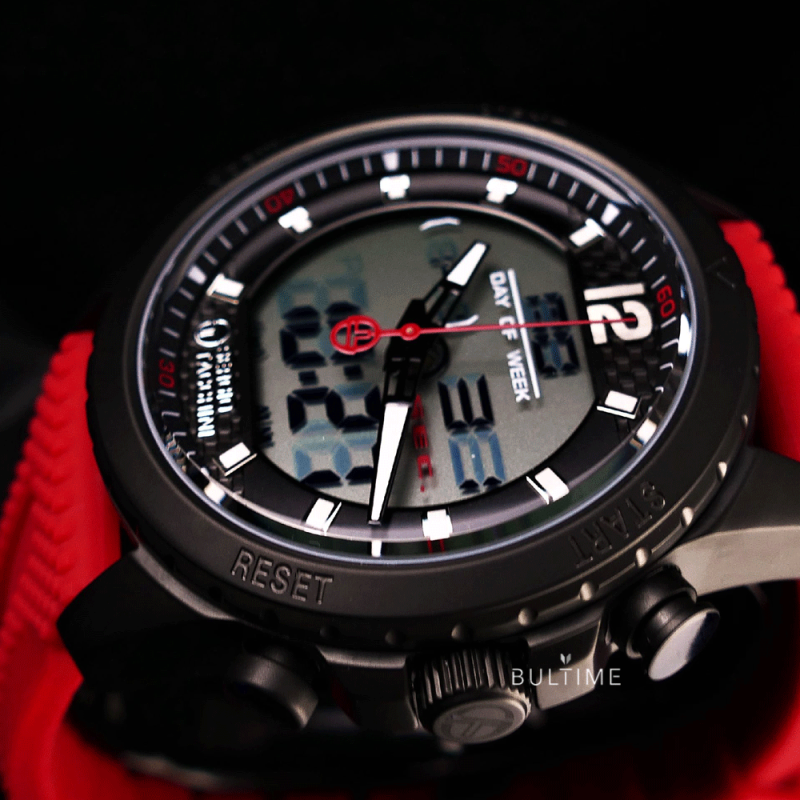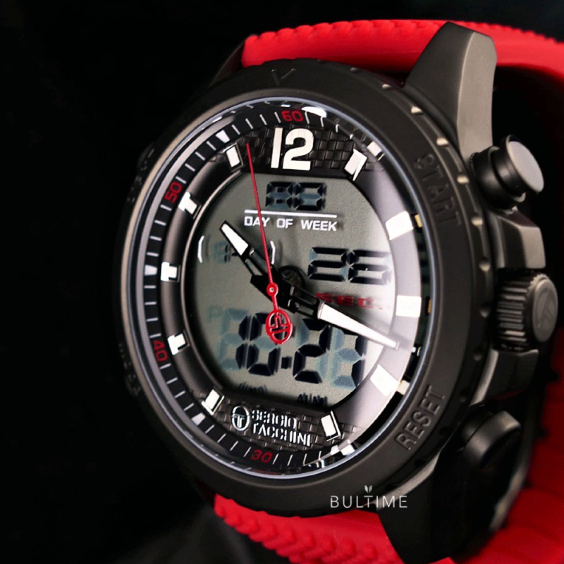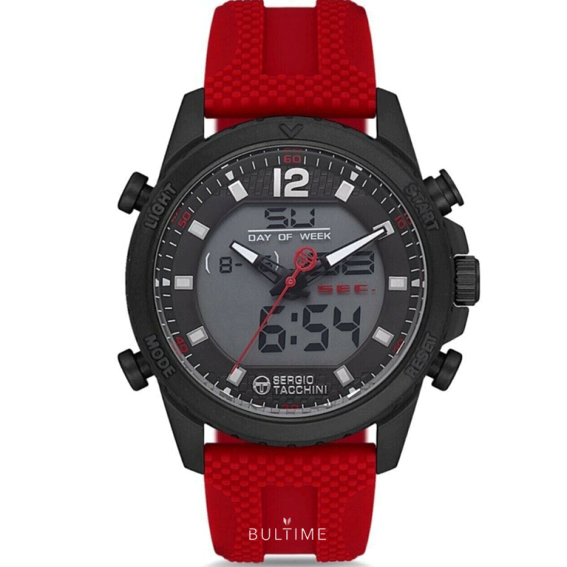 Спортен мъжки часовник Sergio Tacchini с дигитален дисплей от колекцията Heritech. Корпус от неръждаема стомана. Червена силиконова каишка. Стъкло минерал-кристал. Кварцов механизъм. Водоустойчивост 5 ATM - допускат се леки пръски и взимане на душ, не се препоръчва обилно мокрене.