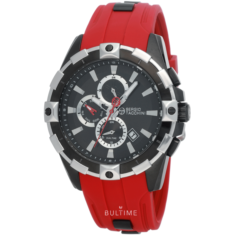 Спортен мъжки часовник Sergio Tacchini от колекцията Heritech. Корпус от неръждаема стомана. Червена силиконова каишка с метални елементи. Черен мултифункционален дисплей с показател за дата, ден и двойно време. Стъкло минерал-кристал. Кварцов механизъм. Водоустойчивост 5 ATM - допускат се леки пръски и взимане на душ, не се препоръчва обилно мокрене.