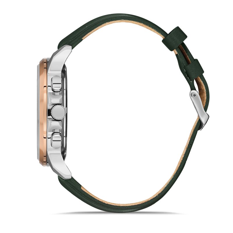 Класически модел мъжки часовник от колекцията Noble с модерна визия. Корпус изработен от неръждаема стомана. Каишка от естествена кожа. Мултифункционален дисплей в тъмнозелен цвят с минерално стъкло, показател за дата, ден от седмицата и двойно време. Кварцов механизъм. Водоустойчивост 5 ATM - допускат се леки пръски и взимане на душ, не се препоръчва обилно мокрене.
