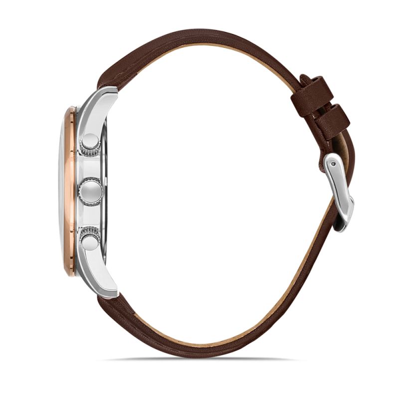 Мъжки часовник от колекцията Noble в спортно-елегантен стил с модерна визия. Кафява каишка от естествена кожа. Корпус от стомана. Мултифункционален дисплей с минерално стъкло. Кварцов механизъм. Водоустойчивост 5 ATM - допускат се леки пръски и взимане на душ, не се препоръчва обилно мокрене.