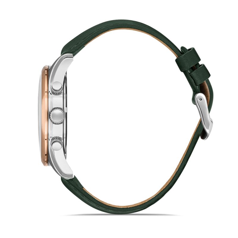 Мъжки часовник от колекцията Noble в спортно-елегантен стил с модерна визия. Тъмнозелена каишка от естествена кожа. Корпус от стомана. Мултифункционален дисплей с минерално стъкло. Кварцов механизъм. Водоустойчивост 5 ATM - допускат се леки пръски и взимане на душ, не се препоръчва обилно мокрене.