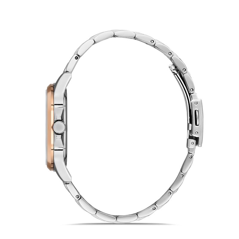 Дамски часовник от колекцията Unique с корпус и верижка от неръждаема стомана. Релефен циферблат в зелен цвят с розово-златисти стрелки и индекси. Кварцов механизъм. Водоустойчивост 5 ATM - допускат се леки пръски и взимане на душ, не се препоръчва обилно мокрене.