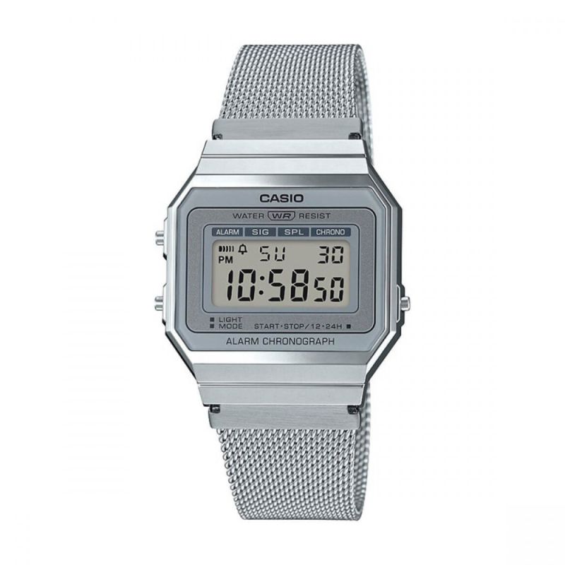 Мъжки часовник Casio с ретро визия от колекцията Vintage. Моделът е в сребрист цвят с корпус от полимерен материал и верижка ситна плетка от неръждаема стомана. Дигитален дисплей . Стъкло от плексиглас. Часовникът е със следните функции: автоматичен календар, хронометър, 12/24 часов формат, дневна аларма, led осветяване на дисплея. Задвижва се от кварцов механизъм. Водоустойчивост 3 ATM - допускат се леки пръски, не се препоръчва обилно мокрене.